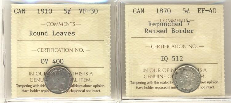 1870 5¢ RB, Repunched 7 EF40 & 1910 RL VF30. Lot of 2 ICCS graded coins.
