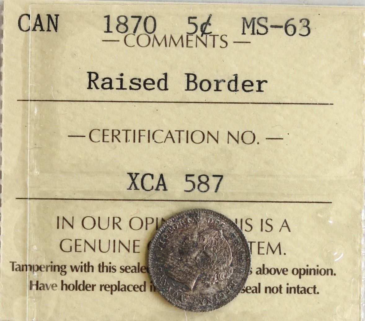 1870 5¢ "Raised Border" ICCS MS-63. Visually stunning example with varying intensities of attractive tones.