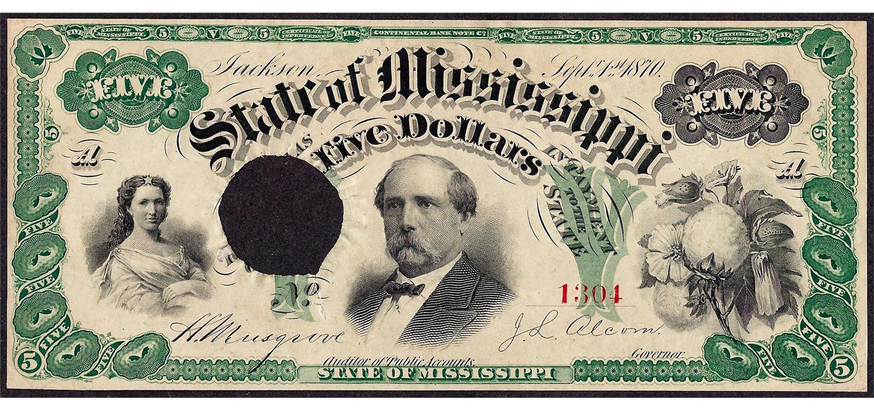 One 1870 $5 State of Mississippi Obsolete Note Cut Canceled.