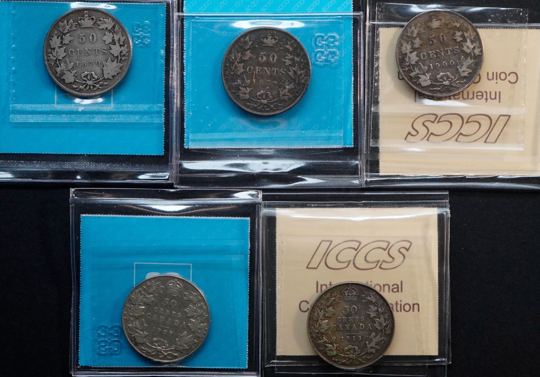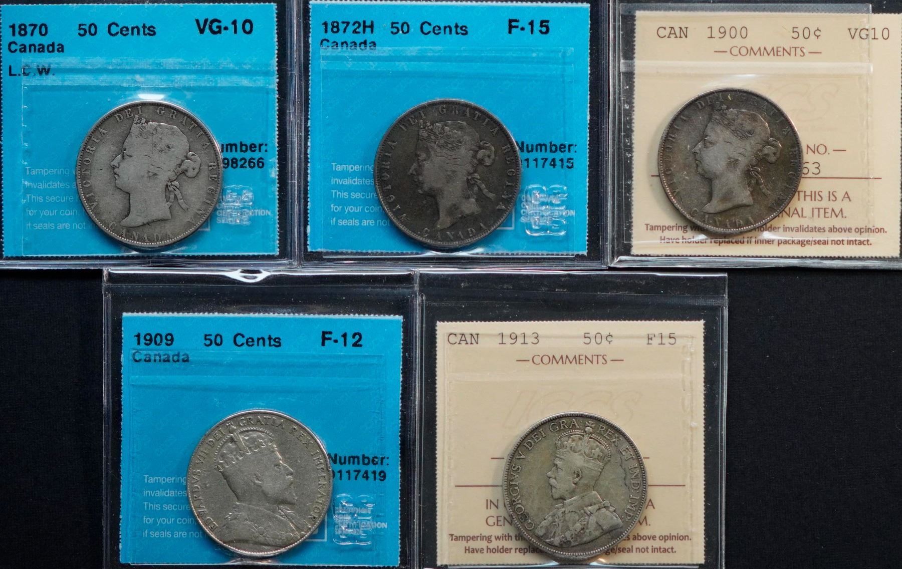 1870 50¢, LCW , 1872H, 1900, 1909 & 1913 all graded ICCS and CCCS Very Good-10 to Choice Fine-15.