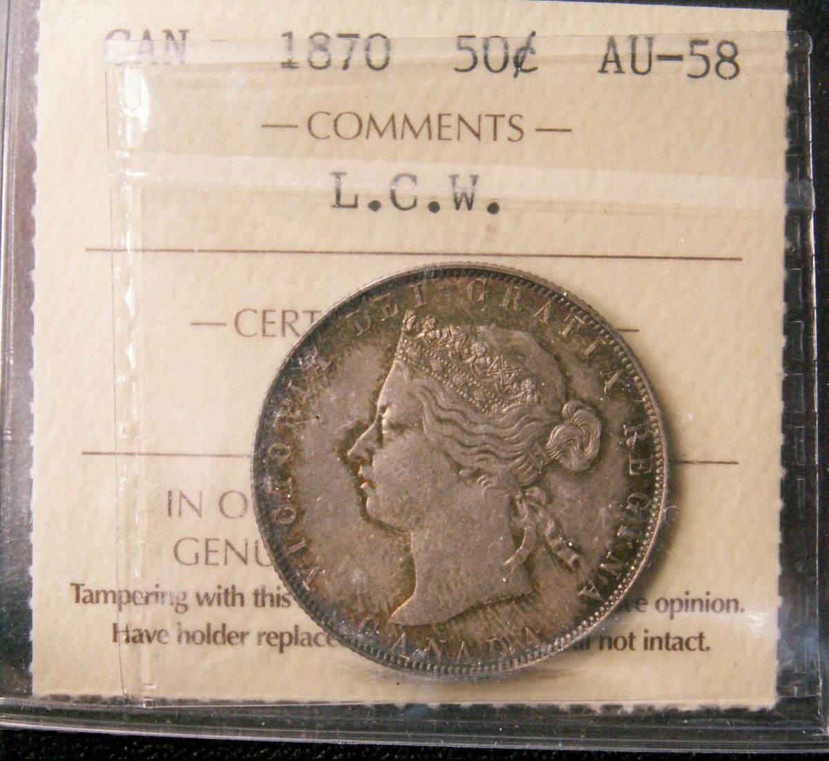 1870 50¢ LCW ICCS AU58. PQ for grade, quite attractive.