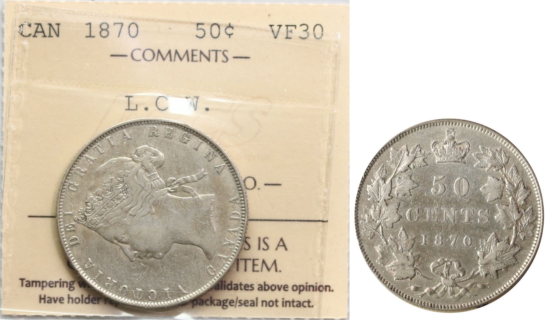 1870 50¢ "LCW" ICCS Choice Very Fine-30 Delicate silver grey tone with remaining lustre.