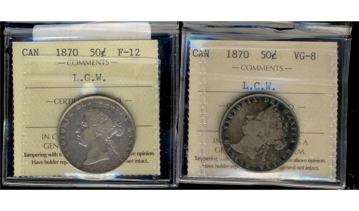 1870 50¢ VG & F12 both LCW. Lot of 2 ICCS graded coins.