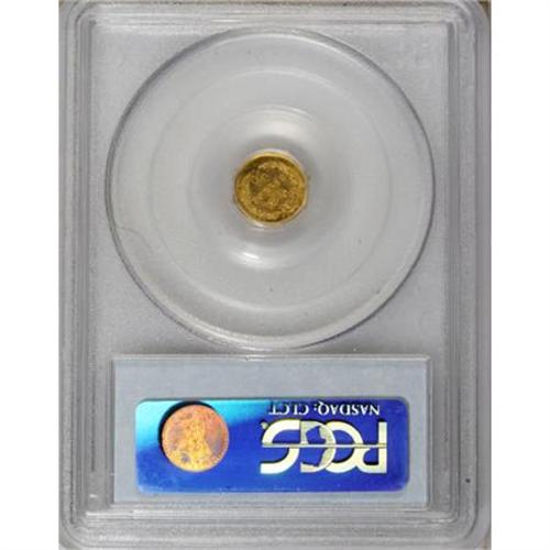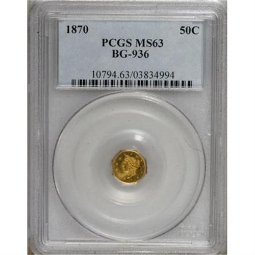 <B>1870 50C Goofy Head Octagonal 50 Cents, BG-936, Low R.5, MS63 PCGS.</B></I> A gleaming yellow-gold representative of the popular Goofy Head variety, well-defined with solid visual appeal. A handful of faint, scattered marks affect the surfaces. Population: 5 in 63, 1 finer (7/07).<BR><BR><b>Shipping:</b> Coins & Currency (<a target="_blank" href="http://www.heritageauctions.com/common/shipping.php">view shipping information</a>)