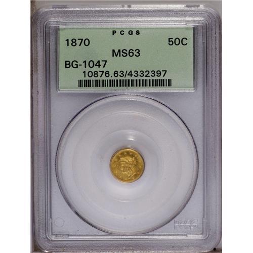 <B>1870<50C> Goofy Head Round 50 Cents, BG-1047, High R.4, MS63 PCGS.</B></I> Yellow and orange-gold surfaces display splashes of lime-green, and somewhat prooflike fields. The design features are relatively well defined, except for some of the star centers and portions of Liberty's hair. A few minor handling marks are noted on each side. Population: 9 in 63, 2 finer (3/06). <BR><BR><B>Important notice:</B> Heritage usually auctions material at the rate of 200-250 lots per hour. On some occasions eBay Live bid software or the Internet may not be able to keep up with the pace of the auction. We recommend placing a realistic absentee bid now as insurance to avoid disappointment. Occasionally the auctioneer may eliminate or reject an eBay Live bid, and the auctioneer may also reopen a lot after the close of the eBay live bidding (usually because we missed an audience bid), and may reject your bid even if it shows you as the winning bidder. By bidding via eBay Live, you agree that Heritage may award the lot to another bidder at its sole discretion under the circumstances described above or any other reasonable circumstances. Since eBay bids are not shown to us until we open the lot on the floor, we treat those bids just like floor bids. In most cases the floor responds before the eBay bid is presented to us, due to Internet lag time, so for consistency we have made it a policy that floor bids are always considered first over tie eBay live bids. Also please note that all Heritage lots purchased through eBay Live carry a 20% Buyer's Premium. Please make sure you read the Terms and Conditions before you bid. This lot is being auctioned in conjunction with a live floor auction by Heritage Galleries & Auctioneers. All final auction and invoice information will be supplied by Heritage Galleries & Auctioneers, and all other information should be considered preliminary. Lot:4802 <BR><BR><B>Winning Notification and Billing:</B> After the FINAL session in this auction is complete, Heritage will send e-mail and snail mail invoices. This process normally takes several days. All final auction and invoice information will be supplied by Heritage Galleries & Auctioneers, and all other information should be considered preliminary. <BR><BR>This auction will be conducted on a live auction floor and over the Internet through eBay Live. If you choose to place an absentee bid, please take a moment to <font color='#0000ff'><u><a href='http://pages.ebay.com/liveauctions/help/before/laabsentee.html'>learn how eBay Live absentee bidding works</a></u></font><font color='#000000'>