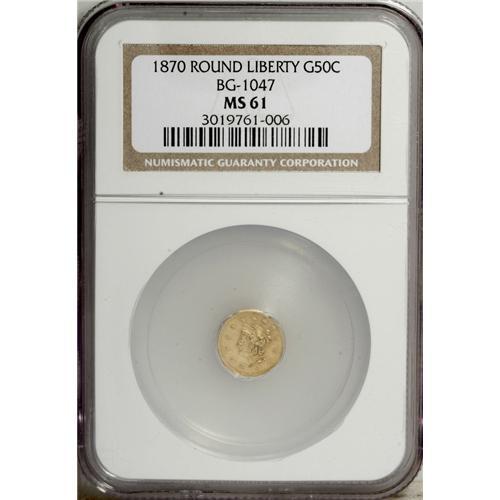 <B>1870 50C Goofy Head Round 50 Cents, BG-1047, High R.4, MS61 NGC.</B></I> A boldly struck example of the crude "Goofy Head" motif. The fields are lustrous but lightly hairlined. Census: 2 in 61, 4 finer (3/07).<BR><BR><b>Shipping:</b> Coins & Currency (<a target="_blank" href="http://www.heritageauctions.com/common/shipping.php">view shipping information</a>)