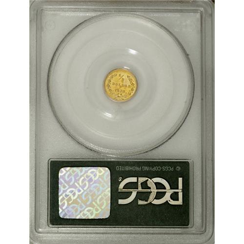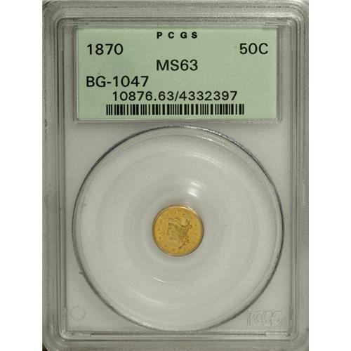<B>1870 50C Liberty Head Round 50 Cents, BG-1047, High R.4, MS63 PCGS.</B></I> This obverse is sometimes called the "Goofy Head" for the unusual engraving style. Looking at the profile of Liberty suggests another name: the "Angry Head." An attractive piece with prooflike fields and brilliant green-gold surfaces, housed in an older green-label holder.<BR><BR><b>Shipping:</b> Coins & Currency (<a target="_blank" href="http://www.heritageauctions.com/common/shipping.php">view shipping information</a>)