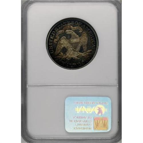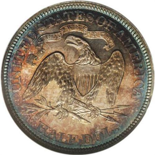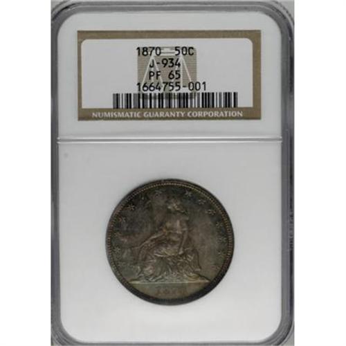 <B>1870 50C Half Dollar, Judd-934, Pollock-1040, Low R.7, PR65 NGC.</B></I> William Barber's seated figure of Liberty faces left on the obverse. Thirteen stars surround Liberty with the date below. She supports a shield with her right hand, and holds an olive branch in her left hand. A liberty pole is behind the shield, a scroll crosses the shield and is inscribed LIBERTY in raised letters. The reverse is the type used for regular issue Seated halves. Struck in silver with a plain edge. This is one of the finest of the dozen or so believed known today. The reverse has magnificent electric-blue, ruby-red, and gold colors, while the obverse features radiant orange and aqua-gray patina. A splendidly struck and carefully preserved Gem.<BR><BR><b>Shipping:</b> Coins & Currency (<a target="_blank" href="http://www.heritageauctions.com/common/shipping.php">view shipping information</a>)