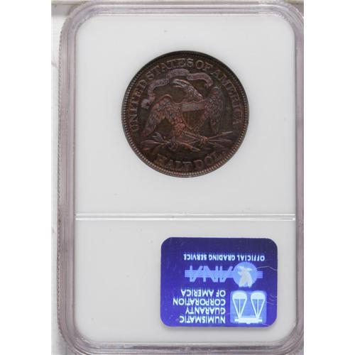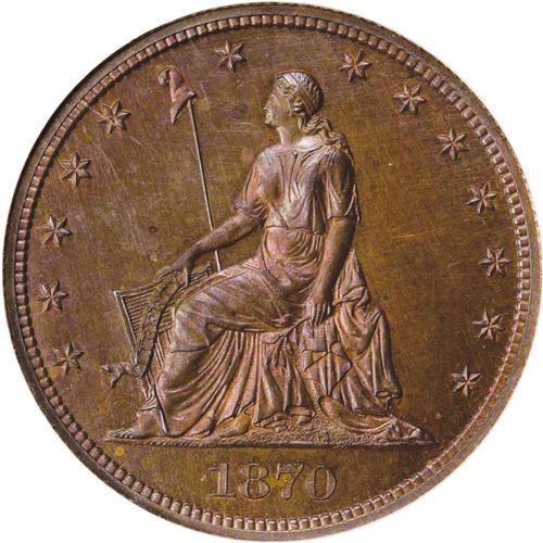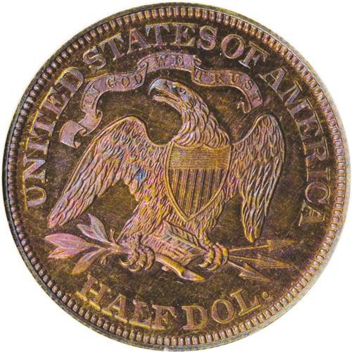 <B>1870<50C> Half Dollar, Judd-935, Pollock-1041, R.7, PR64 Red and Brown NGC.</B></I> A seated figure of Liberty faces left on the obverse with 13 stars surrounding. The date is below, a free-standing liberty pole is behind, and LIBERTY is inscribed on a scroll crossing a small shield. The reverse is the same type that was used to coin regular-issue Seated halves. Struck in copper with a reeded edge. Deep blue patina covers both sides with a significant presence of underlying mint red. An interesting and attractive pattern.