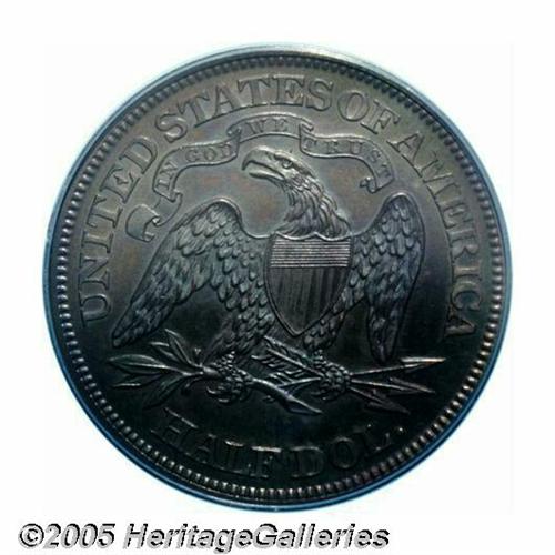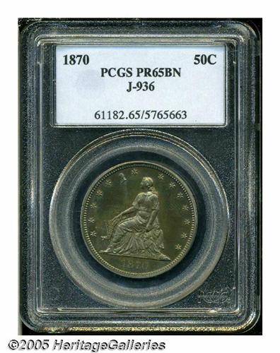 <B>1870<50C> Half Dollar, Judd-936, Pollock-1042, High R.6, PR65 Brown PCGS.</B></I> The Barber Seated Liberty design on the obverse features Liberty with her right hand resting on a shield and tall Liberty pole behind with cap on top. The reverse is from the regular production dies. Struck in copper with a plain edge. Both sides are a deep olive-brown color with subdued reflectiveness in the fields. Blue, red, and gold colorations serve as accents as the coin is turned under a light source.<BR><I>From The Western Hills Collection.</B></I>