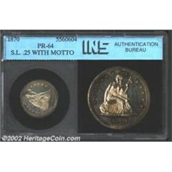 1870 50C Half Dollar PR64 INS (PR62 Cleaned, Questionable Toning). A well struck example that has golden-brown and russet patina at the borders while the centers are lightly toned. The obverse field has numerous hairlines, however, the reverse has an original appearance. Important notice: We expect to be auctioning lots at the rate of 200-250 per hour. Sometimes eBay Premier live bid software cannot keep up with that pace, so we strongly recommend that you place a realistic proxy bid now as insurance to avoid disappointment. Also please note that all Heritage/CAA lots purchased through eBay Premier carry a 20% Buyer's Premium. Please make sure you read the Terms and Conditions.