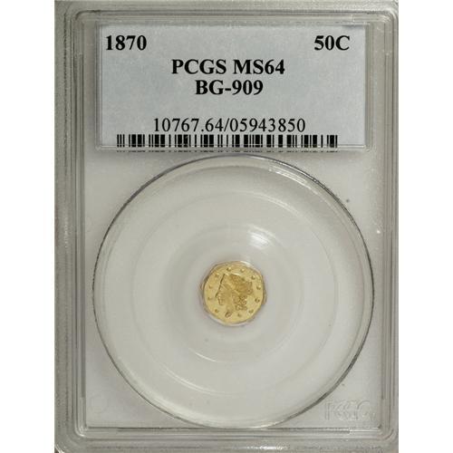 <B>1870 50C Liberty Octagonal 50 Cents, BG-909, R.6, MS64 PCGS.</B></I> PCGS Population (5/3). NGC Census: (0/0). (#10767)<BR><BR><b>Shipping:</b> Coins & Currency (<a target="_blank" href="http://www.heritageauctions.com/common/shipping.php">view shipping information</a>)