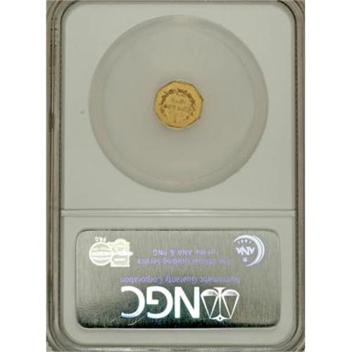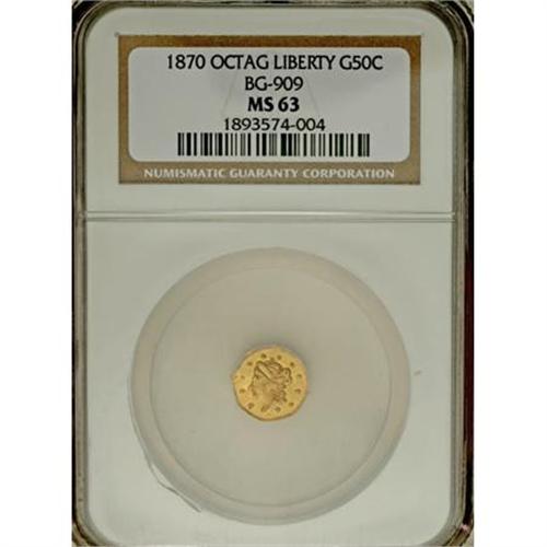 <B>1870 50C Liberty Octagonal 50 Cents, BG-909, R.6, MS63 NGC.</B></I> A rare Period Two variety with crudely engraved legends and motifs. This satiny apricot-gold octagonal half is void of detrimental marks. Census: 1 in 63, 0 finer (3/08).<BR><BR><b>Shipping:</b> Coins & Currency (<a target="_blank" href="http://www.heritageauctions.com/common/shipping.php">view shipping information</a>)