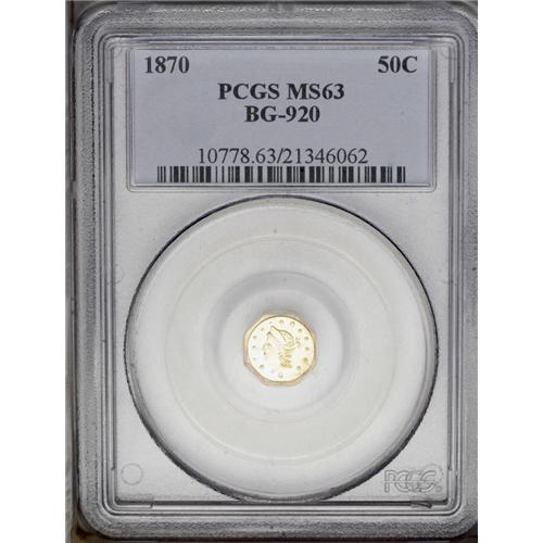 <B>1870<50C> Liberty Octagonal 50 Cents, BG-920, High R.4, MS63 PCGS.</B></I> The 0 in the date is widely punched, and a period separates CAL and GOLD. This bright and attractive canary-gold representative has a few wispy handling marks in the fields that preclude a higher grade. Unknown any finer. Population: 9 in 63, 0 finer (4/06).