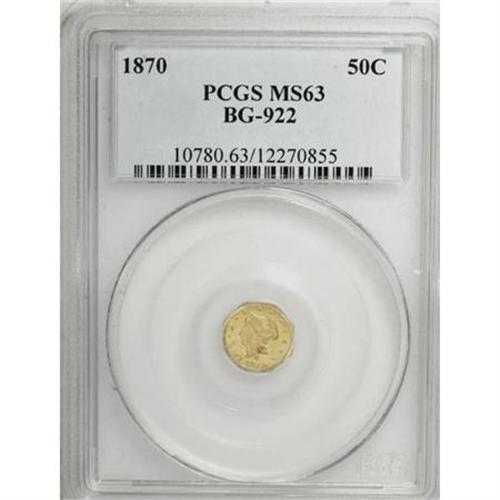 <B>1870 50C Liberty Octagonal 50 Cents, BG-922, R.3, MS63 PCGS.</B></I> A wonderful green-gold example with satiny, reflective surfaces on both sides. The BG-922 ranks among the most plentiful California gold coins, a splendid choice for type collectors who merely want a single example of the series.<BR><BR><b>Shipping:</b> Coins & Currency (<a target="_blank" href="http://www.heritageauctions.com/common/shipping.php">view shipping information</a>)