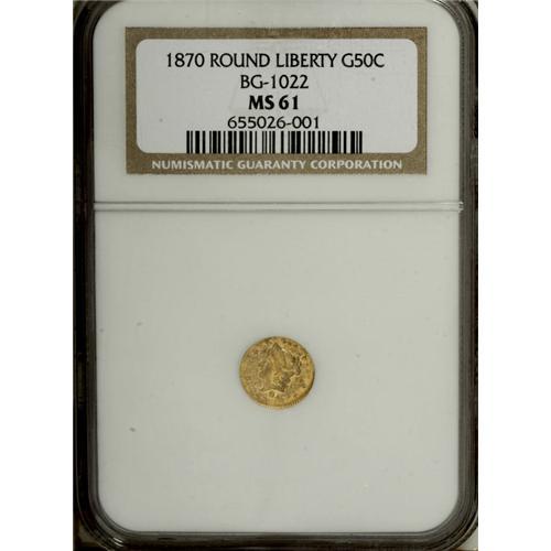 <B>1870 50C Liberty Round 50 Cents, BG-1022, High R.6, MS61 NGC.</B></I> Primarily yellow-gold with occasional aqua freckles and a blush of rose on the central reverse. The 87 in the date is soft, but the overall strike is good. The only example of BG-1022 certified by NGC, as of (4/07).<BR><BR><b>Shipping:</b> Coins & Currency (<a target="_blank" href="http://www.heritageauctions.com/common/shipping.php">view shipping information</a>)