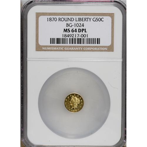 <B>1870 50C Liberty Round 50 Cents, BG-1024, Low R.4, MS64 Deep Mirror Prooflike NGC.</B></I> This canary-gold piece provides imposing reflectivity, and the devices are sharply impressed. As of (3/07), NGC has certified 12 examples of this Breen-Gillio variety, and the present lot is the single finest graded.<BR><BR><b>Shipping:</b> Coins & Currency (<a target="_blank" href="http://www.heritageauctions.com/common/shipping.php">view shipping information</a>)
