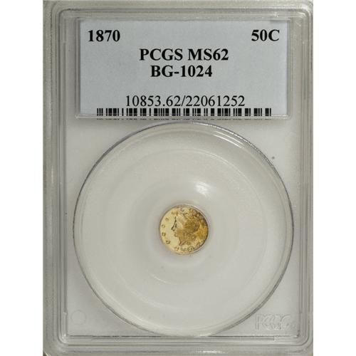 <B>1870 50C Liberty Round 50 Cents, BG-1024, Low R.4, MS62 PCGS.</B></I> PCGS Population (36/20). NGC Census: (4/10). (#10853)<BR><BR><b>Shipping:</b> Coins & Currency (<a target="_blank" href="http://www.heritageauctions.com/common/shipping.php">view shipping information</a>)