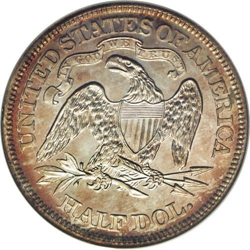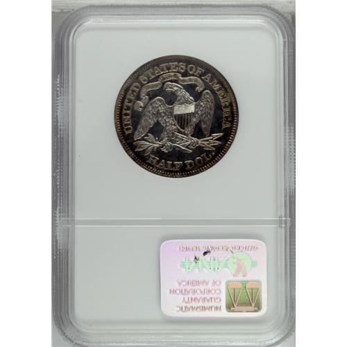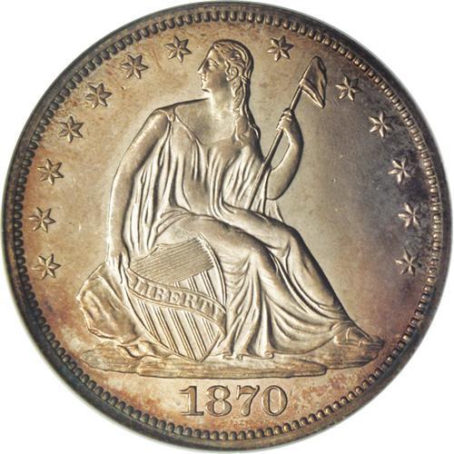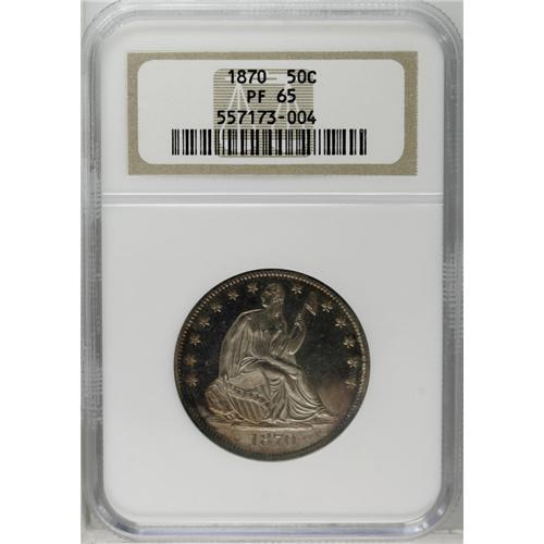 <B>1870<50C> PR65 NGC.</B></I> A strictly graded Gem proof example, showing light russet-gold patination on both sides with silver-gold centers. The surfaces are mostly pristine, although a couple of the shield stripes are weakly impressed, and there is a small apparent planchet flaw through the right (facing) shield corner and Liberty's upper right thigh. An attractive piece, one of only 1,000 proofs minted in this year. Census: 12 in 65, 10 finer (6/06).