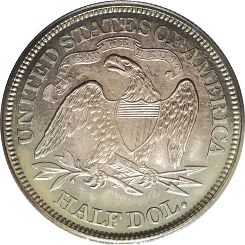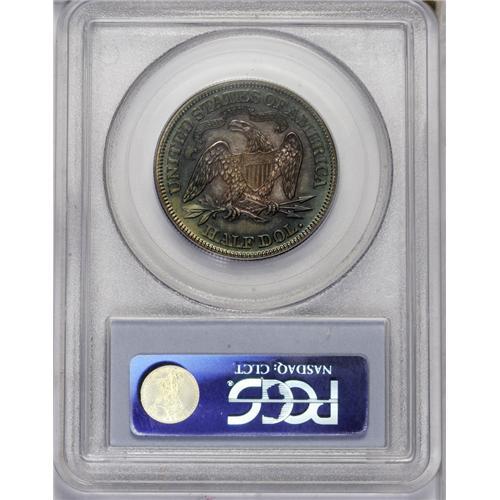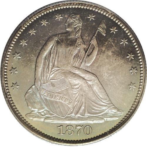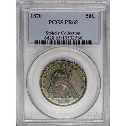 <B>1870<50C> PR65 PCGS.</B></I> Subtle but lovely bluish-green patina covers the periphery of both sides of the pretty Gem proof, with pinkish-gray centers. A few tiny contact marks are noted on Liberty. The "red lines" (raised vertical stripes) in the shield are always weak on this proof reverse die, from an original proof emission of 1,000 pieces.<BR><I>From The Stephen Stokely #1 PCGS Registry Set of Proof Seated Half Dollars.</B></I>
