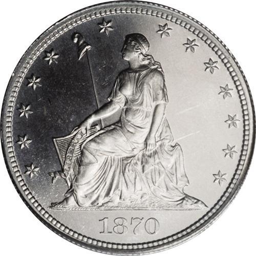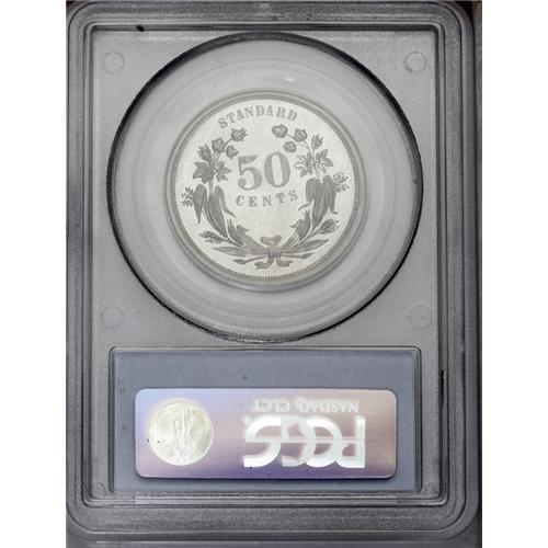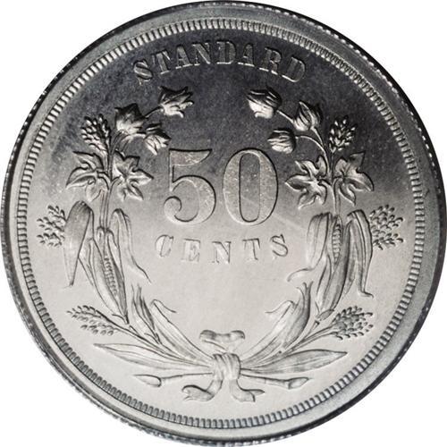 <B>1870 50C Standard Silver Half Dollar, Judd-931, Pollock-1037, High R.7, PR66 Cameo PCGS.</B></I> William Barber's Seated Liberty design, interesting for its placement of the shield behind her legs. The reverse displays an agricultural wreath more suitable for a lower denomination, along with the legends STANDARD and 50 CENTS. An inappropriate pairing of dies, since UNITED STATES OF AMERICA does not appear on either side. Struck in aluminum with a reeded edge. A remarkable specimen, without detectable laminations, hairlines, abrasions, or spots. The strike is exacting, and the quality is unimprovable. The single finest among a combined three examples certified by the two leading grading services.
