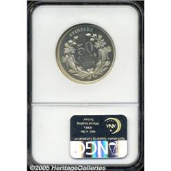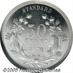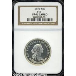 <B>1870 50C Standard Silver Half Dollar, Judd-951, Pollock-1094, R.5, PR66 Cameo NGC.</B></I> The bust of Liberty faces right on the obverse with UNITED STATES OF AMERICA around and the motto IN GOD WE TRUST on a scroll below. Liberty's hair is tied in a bun. On the reverse, the denomination 50 CENTS and date 1870 are in a wreath of cotton and corn with the inscription STANDARD above. Struck in silver with a reeded edge. The center of the reverse is not fully struck, as often encountered with this high relief obverse design. Brilliant throughout, the fields are deeply mirrored and the devices are expectantly frosted, which yields the cameo contrast as noted on the NGC insert. The surfaces are nearly flawless with the only "defect" of note being a squiggly lint mark in the right obverse field in front of Liberty's eye.