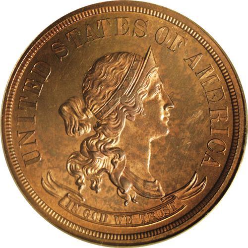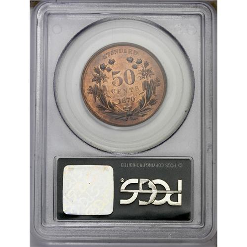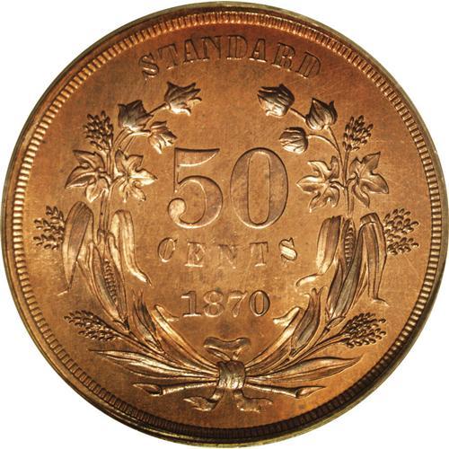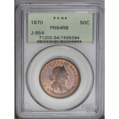 <B>1870<50C> Standard Silver Half Dollar, Judd-954, Pollock-1097, R.7, PR64 Red and Brown PCGS.</B></I> A bust of Liberty faces right. She wears a LIBERTY-inscribed diadem, and her hair is tightly bound with a ribbon. IN GOD WE TRUST reposes within a scroll below, while UNITED STATES OF AMERICA surrounds the portrait. The reverse has a wreath of corn and cotton with 50/CENTS/1870 inside and STANDARD centered above. Struck in copper with a plain edge. This flashy near-Gem possesses ample mint orange, with lilac-rose blushes on the obverse field and portrait. Housed in a green label holder.