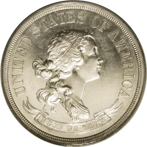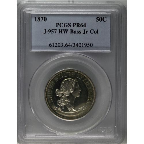 <B>1870<50C> Standard Silver Half Dollar, Judd-957, Pollock-1108, R.5, PR64 PCGS.</B></I> Ex: H.W. Bass Jr. Collection. A bust of Liberty faces right and is surrounded by UNITED STATES OF AMERICA. She wears a headband inscribed LIBERTY, and has a large star on her forehead. IN GOD WE TRUST is below on a banner. The reverse features 50/CENTS/1870 within a wreath of cotton and corn. STANDARD is centered above the wreath. Struck in silver with a reeded edge. Although the B in LIBERTY is typically weak, the remainder of the details are well struck. Although the coin presents as mostly brilliant, there is some hazy, golden-brown patina that is present at the peripheral areas, particularly on the obverse. Population: 8 in 64, 0 finer (7/06).
