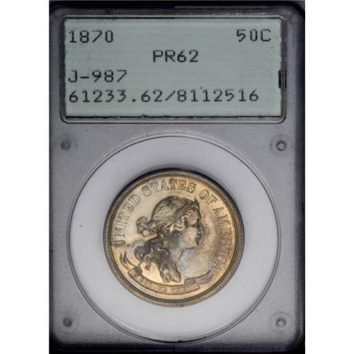 <B>1870<50C> Standard Silver Half Dollar, Judd-987, Pollock-1116, High R.6, PR62 PCGS.</B></I> Standard Silver design with Liberty facing right wearing a headband with a star, a scroll below, and UNITED STATES OF AMERICA above. The reverse has 50 CENTS in the center and is surrounded by a wreath of oak and laurel with 1870 below and STANDARD SILVER above. This design is similar to that used in 1869. Probably fewer than a half dozen are known of this variant. Struck in silver with a reeded edge. Extensively hairlined, the surfaces have golden-brown and lilac toning interspersed over both sides. <BR><BR><B>Important notice:</B> Heritage usually auctions material at the rate of 200-250 lots per hour. On some occasions eBay Live bid software or the Internet may not be able to keep up with the pace of the auction. We recommend placing a realistic absentee bid now as insurance to avoid disappointment. Occasionally the auctioneer may eliminate or reject an eBay Live bid, and the auctioneer may also reopen a lot after the close of the eBay live bidding (usually because we missed an audience bid), and may reject your bid even if it shows you as the winning bidder. By bidding via eBay Live, you agree that Heritage may award the lot to another bidder at its sole discretion under the circumstances described above or any other reasonable circumstances. Since eBay bids are not shown to us until we open the lot on the floor, we treat those bids just like floor bids. In most cases the floor responds before the eBay bid is presented to us, due to Internet lag time, so for consistency we have made it a policy that floor bids are always considered first over tie eBay live bids. Also please note that all Heritage lots purchased through eBay Live carry a 20% Buyer's Premium. Please make sure you read the Terms and Conditions before you bid. This lot is being auctioned in conjunction with a live floor auction by Heritage Galleries & Auctioneers. All final auction and invoice information will be supplied by Heritage Galleries & Auctioneers, and all other information should be considered preliminary. Lot:1848 <BR><BR><B>Winning Notification and Billing:</B> After the FINAL session in this auction is complete, Heritage will send e-mail and snail mail invoices. This process normally takes several days. All final auction and invoice information will be supplied by Heritage Galleries & Auctioneers, and all other information should be considered preliminary. <BR><BR>This auction will be conducted on a live auction floor and over the Internet through eBay Live. If you choose to place an absentee bid, please take a moment to <font color='#0000ff'><u><a href='http://pages.ebay.com/liveauctions/help/before/laabsentee.html'>learn how eBay Live absentee bidding works</a></u></font><font color='#000000'>