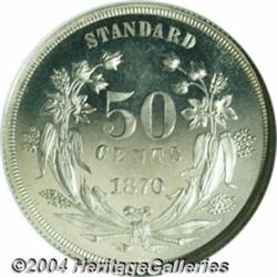 <table><tr><td><table><tr><td>1870 50C Standard Silver Half Dollar, Judd-951, Pollock-1094, R.5, PR66 Cameo NGC. The bust of Liberty faces right on the obverse with UNITED STATES OF AMERICA around and the motto IN GOD WE TRUST on a scroll below. Liberty's hair is tied in a bun. On the reverse, the denomination 50 CENTS and date 1870 are in a wreath of cotton and corn with the inscription STANDARD above. Struck in silver with a reeded edge. The center of the reverse is not fully struck, as often encountered with this high relief obverse design. Brilliant throughout, the fields are deeply mirrored and the devices are expectantly frosted, which yields the cameo contrast as noted on the NGC insert. The surfaces are nearly flawless with the only "defect" of note being a squiggly lint mark in the right obverse field in front of Liberty's eye. <BR><BR><B>Important notice:</B> Heritage usually auctions material at the rate of 200-250 lots per hour. On some occasions eBay Live bid software or the Internet may not be able to keep up with the pace of the auction. We recommend placing a realistic absentee bid now as insurance to avoid disappointment. Occasionally the auctioneer may eliminate or reject an eBay Live bid, and the auctioneer may also reopen a lot after the close of the eBay live bidding (usually because we missed an audience bid), and may reject your bid even if it shows you as the winning bidder. By bidding via eBay Live, you agree that Heritage may award the lot to another bidder at its sole discretion under the circumstances described above or any other reasonable circumstances. Since eBay bids are not shown to us until we open the lot on the floor, we treat those bids just like floor bids. In most cases the floor responds before the eBay bid is presented to us, due to Internet lag time, so for consistency we have made it a policy that floor bids are always considered first over tie eBay live bids. Also please note that all Heritage lots purchased through eBay Live carry a 20% Buyer's Premium. Please make sure you read the Terms and Conditions before you bid. <BR><BR><B>IMPORTANT ANNOUNCEMENT ABOUT RESERVES:</B> Heritage now divulges all reserves on its web site 7 days before every auction. If you want to know whether the reserve on this lot has been met, and if not, what the reserve amount is, please visit this lot page on the HeritageCoin.com web site, or email: bid@HeritageGalleries.com </span></font></td></tr></table></td></tr></table>