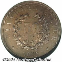 <table><tr><td><table><tr><td>1870 50C Standard Silver Half Dollar, Judd-984, Pollock-1104, R.7, PR66 Red and Brown NGC. The obverse shows a bust of Liberty facing right, surrounded by the peripheral legend UNITED STATES OF AMERICA, and IN GOD WE TRUST on a scroll below. Liberty wears a diadem inscribed LIBERTY, and her hair is tied in a bun. On the reverse, the denomination 50 CENTS is centered in an oak and laurel wreath, with STANDARD SILVER above, and the date 1870 below. Struck in copper with a plain edge. A meticulously struck apricot-gold Gem with a blush of mauve color on the reverse. Lovingly preserved aside from some tiny carbon flecks. Population: 1 in 66, 0 finer (3/04). <BR><BR><B>Important notice:</B> Heritage usually auctions material at the rate of 200-250 lots per hour. On some occasions eBay Live bid software or the Internet may not be able to keep up with the pace of the auction. We recommend placing a realistic absentee bid now as insurance to avoid disappointment. Occasionally the auctioneer may eliminate or reject an eBay Live bid, and the auctioneer may also reopen a lot after the close of the eBay live bidding (usually because we missed an audience bid), and may reject your bid even if it shows you as the winning bidder. By bidding via eBay Live, you agree that Heritage may award the lot to another bidder at its sole discretion under the circumstances described above or any other reasonable circumstances. Since eBay bids are not shown to us until we open the lot on the floor, we treat those bids just like floor bids. In most cases the floor responds before the eBay bid is presented to us, due to Internet lag time, so for consistency we have made it a policy that floor bids are always considered first over tie eBay live bids. Also please note that all Heritage lots purchased through eBay Live carry a 20% Buyer's Premium. Please make sure you read the Terms and Conditions before you bid. <BR><BR><B>IMPORTANT ANNOUNCEMENT ABOUT RESERVES:</B> Heritage now divulges all reserves on its web site 7 days before every auction. If you want to know whether the reserve on this lot has been met, and if not, what the reserve amount is, please visit this lot page on the HeritageCoin.com web site, or email: bid@HeritageGalleries.com </span></font></td></tr></table></td></tr></table>