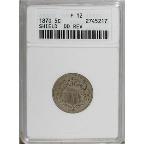 <B>1870 5C Double Die Reverse Fine 12 ANACS.</B></I> NGC Census: (0/151). PCGS Population (0/172). Mintage: 4,806,000. Numismedia Wsl. Price for NGC/PCGS coin in F12: $29. (#3797)<BR><BR><B>Coin Engraver:</B> James B. Longacre<BR><BR><b>Shipping:</b> Coins & Currency (<a target="_blank" href="http://www.heritageauctions.com/common/shipping.php">view shipping information</a>\)
