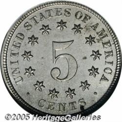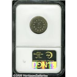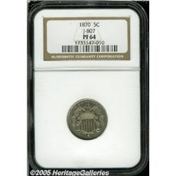 <B>1870 5C Five Cents, Judd-807, Pollock-895, Low R.7, PR64 NGC.</B></I> Both the obverse and reverse designs are the same as that used for regular issue coinage. Struck in nickel on a thin planchet. This near-Gem example is bright, untoned, and virtually devoid of noticeable impairments. A single carbon spot is seen over the S of CENTS on the lower reverse.