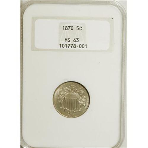 <B>1870 5C MS63 NGC.</B></I> NGC Census: (29/89). PCGS Population (35/102). Mintage: 4,806,000. Numismedia Wsl. Price for NGC/PCGS coin in MS63: $244. (#3797)<BR><BR><B>Coin Engraver:</B> James B. Longacre<BR><BR><b>Shipping:</b> Coins & Currency (<a target="_blank" href="http://www.heritageauctions.com/common/shipping.php">view shipping information</a>\)