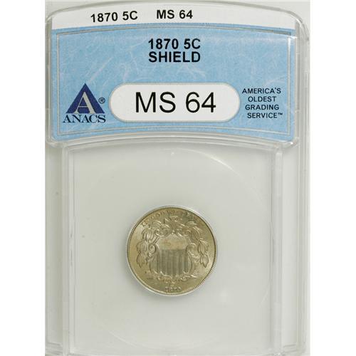 <B>1870 5C MS64 ANACS.</B></I> NGC Census: (49/40). PCGS Population (71/32). Mintage: 4,806,000. Numismedia Wsl. Price: $352. (#3797)<BR><BR><b>Shipping:</b> Coins & Currency (<a target="_blank" href="http://www.heritageauctions.com/common/shipping.php">view shipping information</a>)