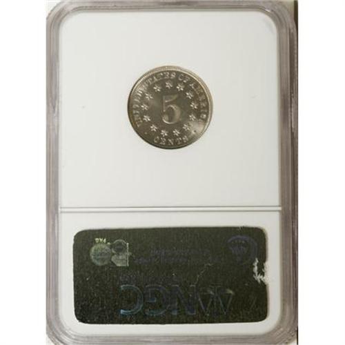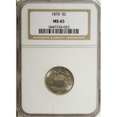 <B>1870 5C MS65 NGC.</B></I> A crisply struck and enticing Gem example of this earlier Shield issue, strongly lustrous beneath delicate layers of gold and sea-green patina. A thin die crack appears over the cross on the obverse. Census: 34 in 65, 6 finer (1/08).<BR><BR><B>Coin Engraver:</B> James B. Longacre<BR><BR><b>Shipping:</b> Coins & Currency (<a target="_blank" href="http://www.heritageauctions.com/common/shipping.php">view shipping information</a>)