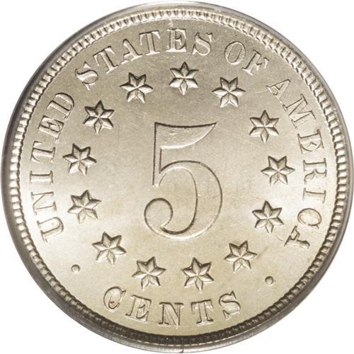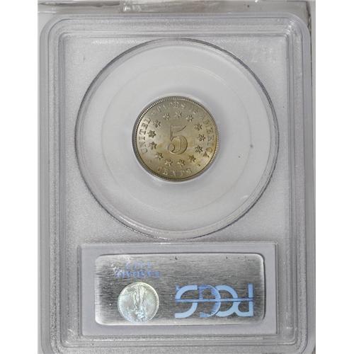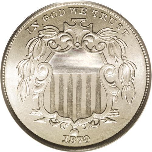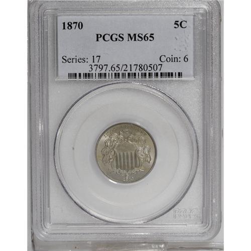 <B>1870<5C> MS65 PCGS.</B></I> Multiple obverse die breaks add considerable interest to the clean fields of this flashy Gem. Light reddish-gold surfaces are accented by darker shades in several areas. Population: 25 in 65, 5 finer (6/06).