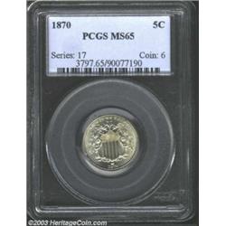 <TABLE cellSpacing=0 cellPadding=0 width="100%" bgColor=#000000 border=0><TBODY><TR><TD width="100%"><TABLE cellSpacing=1 cellPadding=3 width="100%" border=0><TBODY><TR><TD width="100%" bgColor=#79735c><FONT face=arial color=#ffffff size=3><B>Description</B> </FONT></TD></TR><TR><TD width="100%" bgColor=#ffffff><FONT face=arial size=2><B>1870 5C MS65 PCGS.</B></I> Mostly brilliant with exceptionally bright and flashy mint luster. The obverse shows numerous die cracks that surely signaled the end of this die's life. Sharply defined throughout.<BR><I>From the Sunnywood Collection.</B></I> </FONT></TD></TR></TBODY></TABLE></TD></TR></TBODY></TABLE><BR><A name=PricesRealized></A><TABLE cellSpacing=0 cellPadding=0 width="100%" bgColor=#000000 border=0><TBODY><TR><TD width="100%"><TABLE cellSpacing=1 cellPadding=3 width="100%" border=0><TBODY><TR><TD width="100%" bgColor=#79735c><A name=PR><FONT face=arial color=#ffffff size=3><B>Previous Prices from Heritage Auctions</B> </FONT></A></TD></TR><TR><TD bgColor=#f6f6ed><TABLE cellSpacing=0 cellPadding=0 width="100%" border=1><TBODY><TR><TD align=middle width="33%"><B>Date</B></TD><TD align=middle width="33%"><B>Service</B></TD><TD align=middle width="33%"><B>Price</B></TD></TR><TR bgColor=whitesmoke><TD width="33%"><B>08/08/2001</B></TD><TD width="33%">PCGS</TD><TD width="33%">$805.00</TD></TR><TR bgColor=whitesmoke><TD width="33%"><B>05/31/2003</B></TD><TD width="33%">PCGS</TD><TD width="33%">$2,357.50</TD></TR><TR bgColor=whitesmoke><TD width="33%"><B>09/28/2002</B></TD><TD width="33%">NGC</TD><TD width="33%">$977.50</TD></TR><TR bgColor=whitesmoke><TD width="33%"><B>08/13/1999</B></TD><TD width="33%">NGC</TD><TD width="33%">$747.50</TD></TR><TR bgColor=whitesmoke><TD width="33%"><B>01/11/2003</B></TD><TD width="33%">ANACS</TD><TD width="33%">$1,840.00</TD></TR></TBODY></TABLE></TD></TR><TR><TD bgColor=#ffffff><FONT face=arial size=1 ?>PLEASE NOTE: All prices realized reflect the final hammer price PLUS the buyer's premium in auctions that charge a buyer's premium. Each item has a notation at the top of the listing indicating whether that lot included a buyer's premium. Example: A item that sells with a final hammer price of $100 and a 20% buyer's premium will display with a price realized of $120. All information listed is intended to be as accurate as possible, but errors are possible. Please use this guide carefully and inform us of any inaccuracies. </FONT></TD></TR></TBODY></TABLE></TD></TR></TBODY></TABLE><BR><TABLE cellSpacing=0 cellPadding=0 width="100%" bgColor=#000000 border=0><TBODY><TR><TD width="100%"><TABLE cellSpacing=1 cellPadding=3 width="100%" border=0><TBODY><TR><TD width="100%" bgColor=#79735c colSpan=6><FONT face=arial color=#ffffff size=3><B>Price Guide*</B> </FONT></TD></TR><TR bgColor=#f6f6ed><TD align=middle><B>Grade</B> </TD><TD align=middle><B>Coin World<BR>(Trends)</B> </TD><TD align=middle><B>Numismedia<BR>Retail</B> </TD><TD align=middle><B>Numismedia<BR>Wholesale</B> </TD><TD align=middle><B>Coin<BR>Universe</B> </TD><TD align=middle><B>Heritage<BR>Value Index</B> </TD></TR><TR bgColor=#ffffff><TD align=middle>64</TD><TD align=right>$375.00</TD><TD align=right>$440.00</TD><TD align=right>$352.00</TD><TD align=right>$425.00</TD><TD align=right>$273.67</TD></TR><TR style="FONT-WEIGHT: bold" bgColor=#cccfdd><TD align=middle>65</TD><TD align=right>$1,150.00</TD><TD align=right>$970.00</TD><TD align=right>$775.00</TD><TD align=right>$1,400.00</TD><TD align=right>$1,242.63</TD></TR><TR bgColor=#ffffff><TD align=middle>66</TD><TD align=right>$2,750.00</TD><TD align=right>---</TD><TD align=right>$1,950.00</TD><TD align=right>---</TD><TD align=right>$1,925.00</TD></TR><TR bgColor=#ffffff><TD colSpan=6><FONT size=1>*All information listed is intended to be as accurate as possible, but errors are possible. No item may be returned or refused based on this information which is provided as a service to our customers. You should contact each pricing source directly to determine the accuracy of this information. </FONT></TD></TR></TBODY></TABLE></TD></TR></TBODY></TABLE><BR><TABLE cellSpacing=0 cellPadding=0 width="100%" bgColor=#000000 border=0><TBODY><TR><TD width="100%"><TABLE cellSpacing=1 cellPadding=3 width="100%" border=0><TBODY><TR><TD width="100%" bgColor=#79735c><FONT face=arial color=#ffffff size=3><B>Population Guide</B> </FONT></TD></TR><TR bgColor=#ffffff><TD align=middle><!-- Begin Output of Population Grid--><TABLE cellSpacing=0 cellPadding=0 width="100%" border=0><TBODY><TR><TD vAlign=center><TABLE cellSpacing=0 width="100%" border=1 cellsadding="3"><TBODY><TR><TD vAlign=center><TABLE cellSpacing=0 cellPadding=3 width="100%" border=1><TBODY><TR><TD vAlign=center align=middle bgColor=#f0f1e8 colSpan=2 <CENTER><FONT face=Arial size=2><B>PCGS Pop </B></FONT><CENTER></CENTER></TD><TD vAlign=center align=middle bgColor=#f0f1e8 colSpan=2><CENTER><FONT face=Arial size=2><B>NGC Pop</B></CENTER></FONT></TD></TR><TR><TD vAlign=center><FONT face=Arial size=2>(65)</FONT> </TD><TD vAlign=center align=right><FONT face=Arial size=2>18</FONT> </TD><TD vAlign=center><FONT face=Arial size=2>(65)</FONT> </TD><TD vAlign=center align=right><FONT face=Arial size=2>27</FONT> </TD></TR><TR><TD vAlign=center><FONT face=Arial size=2>(>65)</FONT> </TD><TD vAlign=center align=right><FONT face=Arial size=2>2</FONT> </TD><TD vAlign=center><FONT face=Arial size=2>(>65)</FONT> </TD><TD vAlign=center align=right><FONT face=Arial size=2>7</FONT> </TD></TR></TBODY></TABLE></TD></TR></TBODY></TABLE></TD></TR></TBODY></TABLE><!-- End Output of Population Grid--> Important notice: Heritage usually auctions material at the rate of 200-250 lots per hour. On some occasions eBay Live bid software or the Internet may not be able to keep up with the pace of the auction. We recommend placing a realistic absentee bid now as insurance to avoid disappointment. Occasionally the auctioneer may eliminate or reject an eBay Live bid, and the auctioneer may also reo