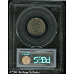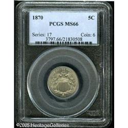 <B>1870 5C MS66 PCGS.</B></I> The obverse is very slightly doubled, visible primarily at the tiny ringlet atop the shield. This example is fully brilliant with light gray color and lots of eye appeal. It is tied for the finest certified by PCGS, and is a clear candidate for a top-quality Registry Set. Population: 4 in 66, 0 finer (1/05). Lot:5837