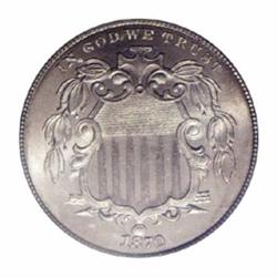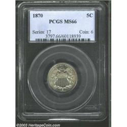 <TABLE cellSpacing=0 cellPadding=0 width="100%" bgColor=#000000 border=0><TBODY><TR><TD width="100%"><TABLE cellSpacing=1 cellPadding=3 width="100%" border=0><TBODY><TR><TD width="100%" bgColor=#79735c><FONT face=arial color=#ffffff size=3><B>Description</B> </FONT></TD></TR><TR><TD width="100%" bgColor=#ffffff><FONT face=arial size=2><B>1870 5C MS66 PCGS.</B></I> Examination of this early Shield nickel shows that even in its fifth year of production the Mint was still experiencing difficulties striking nickel coins, as seen by the multiple die cracks on the obverse. Brilliant throughout, the surfaces are noticeably free from any post-striking impairments, and the mint luster is soft and satiny. In short, this is a very appealing coin for the series or type collector. Population: 2 in 66, 0 finer (8/03). </FONT></TD></TR></TBODY></TABLE></TD></TR></TBODY></TABLE><BR><A name=PricesRealized></A><TABLE cellSpacing=0 cellPadding=0 width="100%" bgColor=#000000 border=0><TBODY><TR><TD width="100%"><TABLE cellSpacing=1 cellPadding=3 width="100%" border=0><TBODY><TR><TD width="100%" bgColor=#79735c><A name=PR><FONT face=arial color=#ffffff size=3><B>Previous Prices from Heritage Auctions</B> </FONT></A></TD></TR><TR><TD bgColor=#f6f6ed><TABLE cellSpacing=0 cellPadding=0 width="100%" border=1><TBODY><TR><TD align=middle width="33%"><B>Date</B></TD><TD align=middle width="33%"><B>Service</B></TD><TD align=middle width="33%"><B>Price</B></TD></TR><TR bgColor=whitesmoke><TD width="33%"><B>08/08/2001</B></TD><TD width="33%">NGC</TD><TD width="33%">$1,897.50</TD></TR></TBODY></TABLE></TD></TR><TR><TD bgColor=#ffffff><FONT face=arial size=1 ?>PLEASE NOTE: All prices realized reflect the final hammer price PLUS the buyer's premium in auctions that charge a buyer's premium. Each item has a notation at the top of the listing indicating whether that lot included a buyer's premium. Example: A item that sells with a final hammer price of $100 and a 20% buyer's premium will display with a price realized of $120. All information listed is intended to be as accurate as possible, but errors are possible. Please use this guide carefully and inform us of any inaccuracies. </FONT></TD></TR></TBODY></TABLE></TD></TR></TBODY></TABLE><BR><TABLE cellSpacing=0 cellPadding=0 width="100%" bgColor=#000000 border=0><TBODY><TR><TD width="100%"><TABLE cellSpacing=1 cellPadding=3 width="100%" border=0><TBODY><TR><TD width="100%" bgColor=#79735c colSpan=6><FONT face=arial color=#ffffff size=3><B>Price Guide*</B> </FONT></TD></TR><TR bgColor=#f6f6ed><TD align=middle><B>Grade</B> </TD><TD align=middle><B>Coin World<BR>(Trends)</B> </TD><TD align=middle><B>Numismedia<BR>Retail</B> </TD><TD align=middle><B>Numismedia<BR>Wholesale</B> </TD><TD align=middle><B>Coin<BR>Universe</B> </TD><TD align=middle><B>Heritage<BR>Value Index</B> </TD></TR><TR bgColor=#ffffff><TD align=middle>65</TD><TD align=right>$1,150.00</TD><TD align=right>$970.00</TD><TD align=right>$775.00</TD><TD align=right>$1,400.00</TD><TD align=right>$1,242.63</TD></TR><TR style="FONT-WEIGHT: bold" bgColor=#cccfdd><TD align=middle>66</TD><TD align=right>$2,750.00</TD><TD align=right>---</TD><TD align=right>$1,950.00</TD><TD align=right>---</TD><TD align=right>$1,925.00</TD></TR><TR bgColor=#ffffff><TD align=middle>67</TD><TD align=right>---</TD><TD align=right>---</TD><TD align=right>---</TD><TD align=right>---</TD><TD align=right>---</TD></TR><TR bgColor=#ffffff><TD colSpan=6><FONT size=1>*All information listed is intended to be as accurate as possible, but errors are possible. No item may be returned or refused based on this information which is provided as a service to our customers. You should contact each pricing source directly to determine the accuracy of this information. </FONT></TD></TR></TBODY></TABLE></TD></TR></TBODY></TABLE><BR><TABLE cellSpacing=0 cellPadding=0 width="100%" bgColor=#000000 border=0><TBODY><TR><TD width="100%"><TABLE cellSpacing=1 cellPadding=3 width="100%" border=0><TBODY><TR><TD width="100%" bgColor=#79735c><FONT face=arial color=#ffffff size=3><B>Population Guide</B> </FONT></TD></TR><TR bgColor=#ffffff><TD align=middle><!-- Begin Output of Population Grid--><TABLE cellSpacing=0 cellPadding=0 width="100%" border=0><TBODY><TR><TD vAlign=center><TABLE cellSpacing=0 width="100%" border=1 cellsadding="3"><TBODY><TR><TD vAlign=center><TABLE cellSpacing=0 cellPadding=3 width="100%" border=1><TBODY><TR><TD vAlign=center align=middle bgColor=#f0f1e8 colSpan=2 <CENTER><FONT face=Arial size=2><B>PCGS Pop </B></FONT><CENTER></CENTER></TD><TD vAlign=center align=middle bgColor=#f0f1e8 colSpan=2><CENTER><FONT face=Arial size=2><B>NGC Pop</B></CENTER></FONT></TD></TR><TR><TD vAlign=center><FONT face=Arial size=2>(66)</FONT> </TD><TD vAlign=center align=right><FONT face=Arial size=2>2</FONT> </TD><TD vAlign=center><FONT face=Arial size=2>(66)</FONT> </TD><TD vAlign=center align=right><FONT face=Arial size=2>7</FONT> </TD></TR><TR><TD vAlign=center><FONT face=Arial size=2>(>66)</FONT> </TD><TD vAlign=center align=right><FONT face=Arial size=2>0</FONT> </TD><TD vAlign=center><FONT face=Arial size=2>(>66)</FONT> </TD><TD vAlign=center align=right><FONT face=Arial size=2>0</FONT> </TD></TR></TBODY></TABLE></TD></TR></TBODY></TABLE></TD></TR></TBODY></TABLE><!-- End Output of Population Grid--> Important notice: Heritage usually auctions material at the rate of 200-250 lots per hour. On some occasions eBay Live bid software or the Internet may not be able to keep up with the pace of the auction. We recommend placing a realistic absentee bid now as insurance to avoid disappointment. Occasionally the auctioneer may eliminate or reject an eBay Live bid, and the auctioneer may also reopen a lot after the close of the eBay live bidding (usually because we missed an audience bid), and may reject your bid even if it shows you as the winning bidder. By bidding via eBay Live, you agree that Heritage may award the lot to another bidder at its sole discretion under