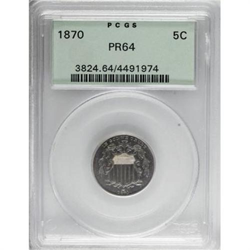 <B>1870 5C PR64 PCGS.</B></I> PCGS Population (124/75). NGC Census: (106/81). Mintage: 1,000. Numismedia Wsl. Price for NGC/PCGS coin in PR64: $380. (#3824)<BR><BR><B>Coin Engraver:</B> James B. Longacre<BR><BR><b>Shipping:</b> Coins & Currency (<a target="_blank" href="http://www.heritageauctions.com/common/shipping.php">view shipping information</a>\)