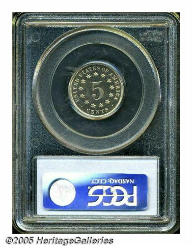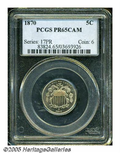 <B>1870<5C> PR65 Cameo PCGS.</B></I> Nicely mirrored with appreciable frosting on the devices, particularly on the obverse. A flashy early date proof Shield Nickel, currently scarce with the Cameo designation. Population: 12 in 65 Cameo, 11 finer in Cameo condition (4/05).