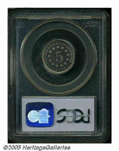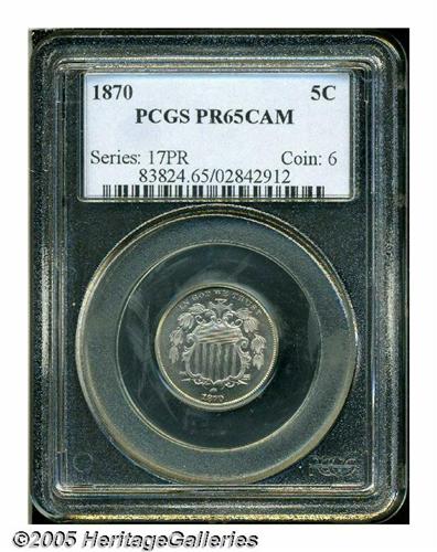<B>1870<5C> PR65 Cameo PCGS.</B></I> Sharply struck and lightly toned, with a very frosty overall appearance, and mild cameo contrast evident on each side. A planchet flaw (as struck) is noticeable near the top of the shield, but should not have influenced the technical grade assessment of the piece. A conditionally scarce Gem proof. Population: 12 in 65 Cameo, 11 finer (5/05).<BR><I>From The Western Hills Collection.</B></I>