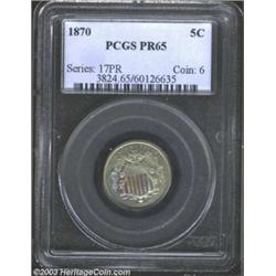 <TABLE cellSpacing=0 cellPadding=0 width="100%" bgColor=#000000 border=0><TBODY><TR><TD width="100%"><TABLE cellSpacing=1 cellPadding=3 width="100%" border=0><TBODY><TR><TD width="100%" bgColor=#79735c><FONT face=arial color=#ffffff size=3><B>Description</B> </FONT></TD></TR><TR><TD width="100%" bgColor=#ffffff><FONT face=arial size=2><B>1870 5C PR65 PCGS.</B></I> Lovely steel-blue and chartreuse colors are seen on each side, generating splendid eye appeal. A fully struck and seemingly pristine Gem proof. </FONT></TD></TR></TBODY></TABLE></TD></TR></TBODY></TABLE><BR><A name=PricesRealized></A><TABLE cellSpacing=0 cellPadding=0 width="100%" bgColor=#000000 border=0><TBODY><TR><TD width="100%"><TABLE cellSpacing=1 cellPadding=3 width="100%" border=0><TBODY><TR><TD width="100%" bgColor=#79735c><A name=PR><FONT face=arial color=#ffffff size=3><B>Previous Prices from Heritage Auctions</B> </FONT></A></TD></TR><TR><TD bgColor=#f6f6ed><TABLE cellSpacing=0 cellPadding=0 width="100%" border=1><TBODY><TR><TD align=middle width="33%"><B>Date</B></TD><TD align=middle width="33%"><B>Service</B></TD><TD align=middle width="33%"><B>Price</B></TD></TR><TR bgColor=whitesmoke><TD width="33%"><B>11/23/2002</B></TD><TD width="33%">NGC</TD><TD width="33%">$661.25</TD></TR><TR bgColor=whitesmoke><TD width="33%"><B>11/23/2002</B></TD><TD width="33%">PCGS</TD><TD width="33%">$776.25</TD></TR><TR bgColor=whitesmoke><TD width="33%"><B>09/30/2002</B></TD><TD width="33%">PCGS</TD><TD width="33%">$833.75</TD></TR><TR bgColor=whitesmoke><TD width="33%"><B>10/02/2000</B></TD><TD width="33%">PCGS</TD><TD width="33%">$1,437.00</TD></TR><TR bgColor=whitesmoke><TD width="33%"><B>02/23/2002</B></TD><TD width="33%">PCGS</TD><TD width="33%">$1,207.50</TD></TR><TR bgColor=whitesmoke><TD width="33%"><B>11/17/2001</B></TD><TD width="33%">PCGS</TD><TD width="33%">$661.25</TD></TR><TR bgColor=whitesmoke><TD width="33%"><B>10/07/2001</B></TD><TD width="33%">PCGS</TD><TD width="33%">$805.00</TD></TR><TR bgColor=whitesmoke><TD width="33%"><B>08/08/2001</B></TD><TD width="33%">PCGS</TD><TD width="33%">$747.50</TD></TR><TR bgColor=whitesmoke><TD width="33%"><B>06/01/2000</B></TD><TD width="33%">PCGS</TD><TD width="33%">$978.00</TD></TR><TR bgColor=whitesmoke><TD width="33%"><B>03/01/1996</B></TD><TD width="33%">PCGS</TD><TD width="33%">$1,100.00</TD></TR><TR bgColor=whitesmoke><TD width="33%"><B>03/01/1997</B></TD><TD width="33%">PCGS</TD><TD width="33%">$880.00</TD></TR><TR bgColor=whitesmoke><TD width="33%"><B>10/06/2000</B></TD><TD width="33%">PCGS</TD><TD width="33%">$1,495.00</TD></TR><TR bgColor=whitesmoke><TD width="33%"><B>11/17/2000</B></TD><TD width="33%">PCGS</TD><TD width="33%">$891.25</TD></TR><TR bgColor=whitesmoke><TD width="33%"><B>12/12/2000</B></TD><TD width="33%">NGC</TD><TD width="33%">$850.00</TD></TR><TR bgColor=whitesmoke><TD width="33%"><B>04/23/1999</B></TD><TD width="33%">NGC</TD><TD width="33%">$805.00</TD></TR><TR bgColor=whitesmoke><TD width="33%"><B>11/14/2000</B></TD><TD width="33%">NGC</TD><TD width="33%">$1,000.00</TD></TR><TR bgColor=whitesmoke><TD width="33%"><B>11/30/1999</B></TD><TD width="33%">NGC</TD><TD width="33%">$825.00</TD></TR><TR bgColor=whitesmoke><TD width="33%"><B>03/28/2000</B></TD><TD width="33%">NGC</TD><TD width="33%">$901.00</TD></TR><TR bgColor=whitesmoke><TD width="33%"><B>08/13/1999</B></TD><TD width="33%">NGC</TD><TD width="33%">$805.00</TD></TR><TR bgColor=whitesmoke><TD width="33%"><B>07/01/1996</B></TD><TD width="33%">NGC</TD><TD width="33%">$770.00</TD></TR><TR bgColor=whitesmoke><TD width="33%"><B>06/02/2001</B></TD><TD width="33%">PCGS</TD><TD width="33%">$948.75</TD></TR><TR bgColor=whitesmoke><TD width="33%"><B>02/23/2001</B></TD><TD width="33%">PCGS</TD><TD width="33%">$920.00</TD></TR><TR bgColor=whitesmoke><TD width="33%"><B>08/08/1998</B></TD><TD width="33%">PCGS</TD><TD width="33%">$770.00</TD></TR><TR bgColor=whitesmoke><TD width="33%"><B>11/22/1996</B></TD><TD width="33%">PCGS</TD><TD width="33%">$1,111.00</TD></TR><TR bgColor=whitesmoke><TD width="33%"><B>03/01/2003</B></TD><TD width="33%">NGC</TD><TD width="33%">$862.50</TD></TR><TR bgColor=whitesmoke><TD width="33%"><B>05/03/2003</B></TD><TD width="33%">PCGS</TD><TD width="33%">$805.00</TD></TR><TR bgColor=whitesmoke><TD width="33%"><B>05/31/2003</B></TD><TD width="33%">NGC</TD><TD width="33%">$805.00</TD></TR></TBODY></TABLE></TD></TR><TR><TD bgColor=#ffffff><FONT face=arial size=1 ?>PLEASE NOTE: All prices realized reflect the final hammer price PLUS the buyer's premium in auctions that charge a buyer's premium. Each item has a notation at the top of the listing indicating whether that lot included a buyer's premium. Example: A item that sells with a final hammer price of $100 and a 20% buyer's premium will display with a price realized of $120. All information listed is intended to be as accurate as possible, but errors are possible. Please use this guide carefully and inform us of any inaccuracies. </FONT></TD></TR></TBODY></TABLE></TD></TR></TBODY></TABLE><BR><TABLE cellSpacing=0 cellPadding=0 width="100%" bgColor=#000000 border=0><TBODY><TR><TD width="100%"><TABLE cellSpacing=1 cellPadding=3 width="100%" border=0><TBODY><TR><TD width="100%" bgColor=#79735c colSpan=6><FONT face=arial color=#ffffff size=3><B>Price Guide*</B> </FONT></TD></TR><TR bgColor=#f6f6ed><TD align=middle><B>Grade</B> </TD><TD align=middle><B>Coin World<BR>(Trends)</B> </TD><TD align=middle><B>Numismedia<BR>Retail</B> </TD><TD align=middle><B>Numismedia<BR>Wholesale</B> </TD><TD align=middle><B>Coin<BR>Universe</B> </TD><TD align=middle><B>Heritage<BR>Value Index</B> </TD></TR><TR bgColor=#ffffff><TD align=middle>64</TD><TD align=right>---</TD><TD align=right>$455.00</TD><TD align=right>$364.00</TD><TD align=right>$365.00</TD><TD align=right>$290.17</TD></TR><TR style="FONT-WEIGHT: bold" bgColor=#cccfdd><TD align=middle>65</TD><TD align=right>---</TD><TD align=right>---</TD><TD align=right>$950.00</TD><TD align=right>$1,550.00</TD><