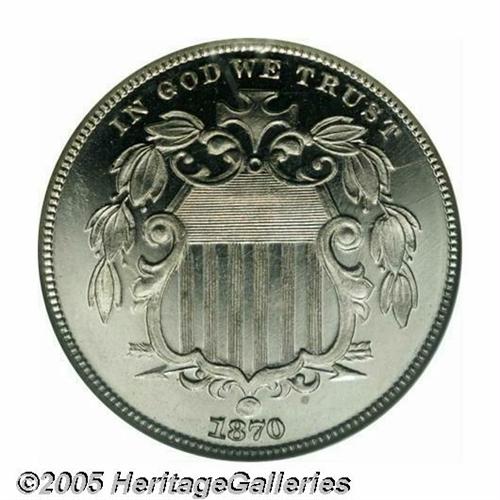 <B>1870<5C> PR66 Cameo NGC.</B></I> An exquisite cameo Gem proof, as frosty and eye-appealing as any specimen of this type which we have seen recently. Some light, milky patina resides near the left obverse border. Fully struck and near-pristine, as expected for a high grade proof. Population: 11 in 66 Cameo, 1 finer (3/05).