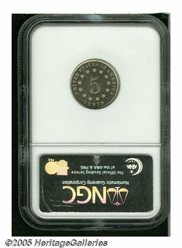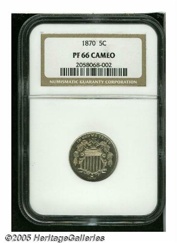 <B>1870<5C> PR66 Cameo NGC.</B></I> An exquisite cameo Gem proof, as frosty and full of eye-appeal. Some light, milky patina resides near the left obverse border. Fully struck and near-pristine, as expected for a high grade proof. Population: 11 in 66 Cameo, 1 finer (6/05).