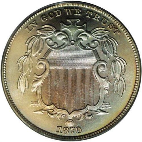 <B>1870<5C> PR66 Cameo PCGS.</B></I> This is a stunning Premium Gem proof with exceptional Cameo contrast and lovely toning. The surfaces are mostly pale blue-gray, and they are enhanced by rainbow iridescence on both sides. The fields are fully and deeply mirrored, with lustrous devices on both sides. Few could possibly equal or exceed this example for its overall aesthetic appeal. Population: 12 in 66 Cameo, 0 finer (3/06). <BR><BR><B>Important notice:</B> Heritage usually auctions material at the rate of 200-250 lots per hour. On some occasions eBay Live bid software or the Internet may not be able to keep up with the pace of the auction. We recommend placing a realistic absentee bid now as insurance to avoid disappointment. Occasionally the auctioneer may eliminate or reject an eBay Live bid, and the auctioneer may also reopen a lot after the close of the eBay live bidding (usually because we missed an audience bid), and may reject your bid even if it shows you as the winning bidder. By bidding via eBay Live, you agree that Heritage may award the lot to another bidder at its sole discretion under the circumstances described above or any other reasonable circumstances. Since eBay bids are not shown to us until we open the lot on the floor, we treat those bids just like floor bids. In most cases the floor responds before the eBay bid is presented to us, due to Internet lag time, so for consistency we have made it a policy that floor bids are always considered first over tie eBay live bids. Also please note that all Heritage lots purchased through eBay Live carry a 20% Buyer's Premium. Please make sure you read the Terms and Conditions before you bid. This lot is being auctioned in conjunction with a live floor auction by Heritage Galleries & Auctioneers. All final auction and invoice information will be supplied by Heritage Galleries & Auctioneers, and all other information should be considered preliminary. Lot:879 <BR><BR><B>Winning Notification and Billing:</B> After the FINAL session in this auction is complete, Heritage will send e-mail and snail mail invoices. This process normally takes several days. All final auction and invoice information will be supplied by Heritage Galleries & Auctioneers, and all other information should be considered preliminary. <BR><BR>This auction will be conducted on a live auction floor and over the Internet through eBay Live. If you choose to place an absentee bid, please take a moment to <font color='#0000ff'><u><a href='http://pages.ebay.com/liveauctions/help/before/laabsentee.html'>learn how eBay Live absentee bidding works</a></u></font><font color='#000000'>