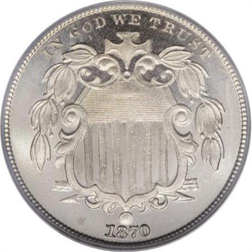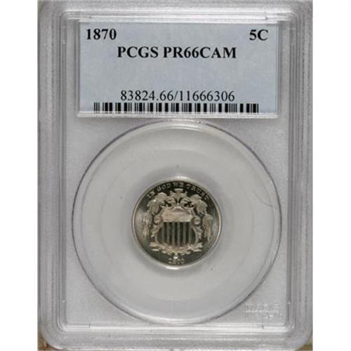 <B>1870 5C PR66 Cameo PCGS.</B></I> A splendidly preserved cameo that is nicely mirrored in the fields. The reverse displays subtle shadings of lilac and rose, while there is almost no color to be seen on the obverse. Contrast on coins from this era is more a matter of chance than design, as most were created from a fresh set of dies and not intentionally produced for aesthetic appeal. Population: 14 in 66 Cameo, 0 finer (4/07).<BR><BR><b>Shipping:</b> Coins & Currency (<a target="_blank" href="http://www.heritageauctions.com/common/shipping.php">view shipping information</a>)