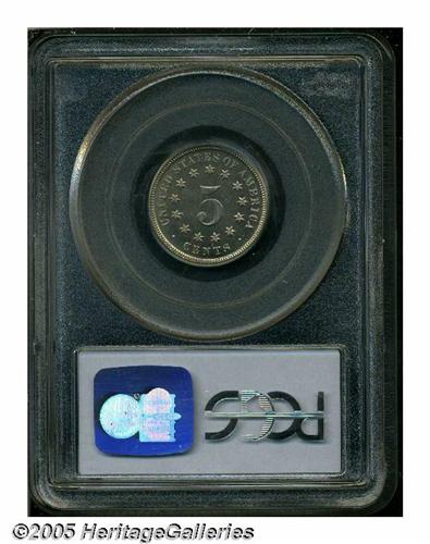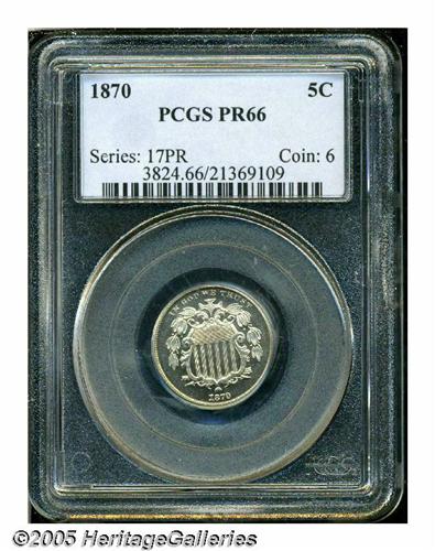 <B>1870<5C> PR66 PCGS.</B></I> This flashy Shield nickel displays very subtle hints of faint gold color, and virtually pristine surfaces that are devoid of mentionable marks. The design features are well impressed, with only minor softness in some of the horizontal shield lines. Population: 4 in 66, 0 finer (6/05).
