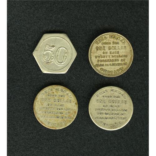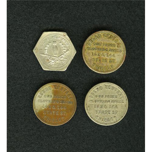 <B>(1870-90) Group Lot of Four Merchants Tokens.</B></I> Three tokens issued by Grand Central Clothing House, Chicago. The three are listed on page 620 of the fourth edition of the <I>Standard Catalog of United States Tokens 1700-1900</B></I> by Russ Rulau. The catalog numbers are Il-Ch-28 in German silver; Il-Ch-28a, in silvered brass; and Il-Ch-28b, in tin-plated copper. Also included is a fourth piece issued by L. Boche of Chicago; it is an unlisted denomination in Rulau, but given the number Il-Ch 2a.